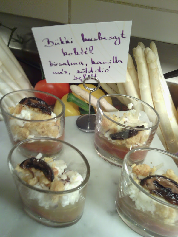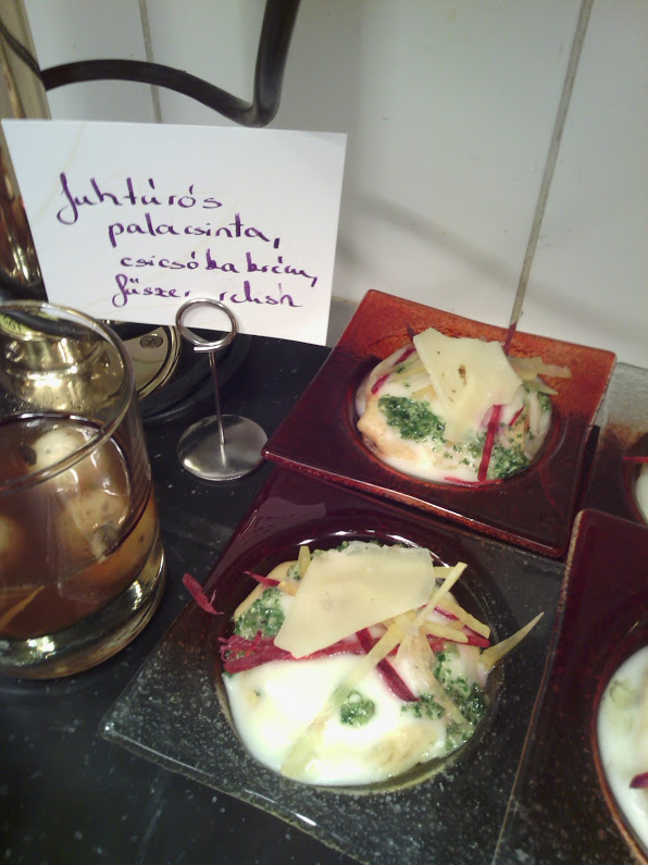A bükki kecskesajttal kapcsolatban megtudtam, hogy az étterem igyekszik minél több hozzávalót magyar vállalkozóktól beszerezni, innen származik a kecskesajt is. Maga a koktél kicsit krémes-morzsás állagú volt, nagyon jó íz-harmóniával rendelkezett és kicsit édes volt. Nálam simán bevált desszertnek is 🙂