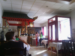 Belépve már sokkal kellemesebb látvány fogadott. Több kerek asztal, díszített falak, tükrös mennyezet. Igaz, jobbfelől a kínai gyorsbüfékből ismert tálalópult rontja a képet.